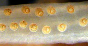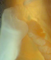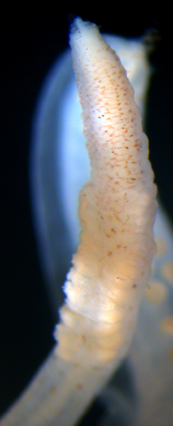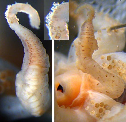 Figure. Oral view of an arm (left) and a sucker (right) of M. atlantica, holotype. Note the lack of arm protective membranes. Photographs by R. Young.